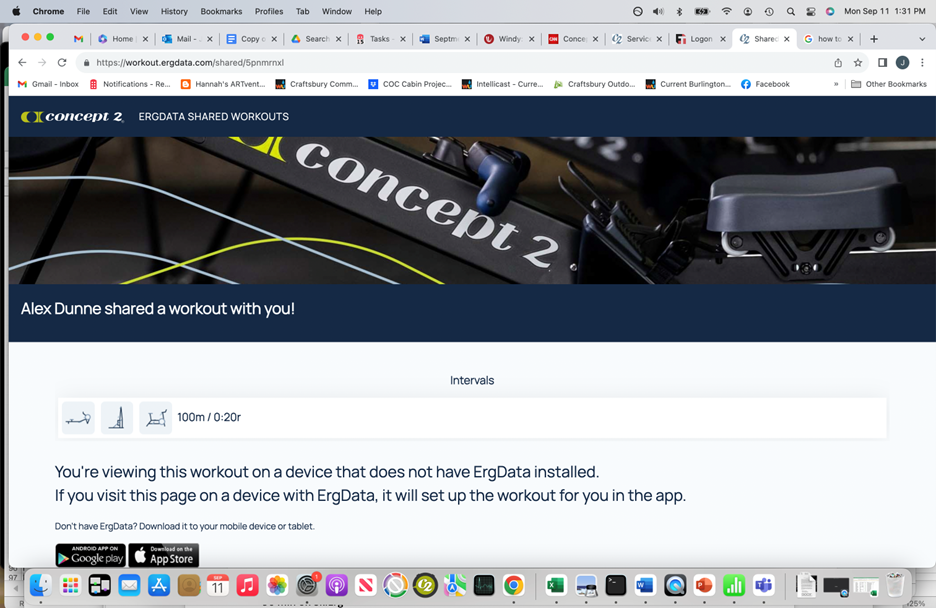 Hvis treningsøkten deles slik at du kan prøve den, vil du motta en melding som angir navnet på personen som har delt treningsøkten med deg, med en lenke til treningsøkten. Hvis du klikker på lenken på enheten der du bruker ErgData, åpnes treningsøkten automatisk i ErgData – klar til å gjennomføres! Bare koble til din PM5 og klikk på «Ready». Se bildet nedenfor: