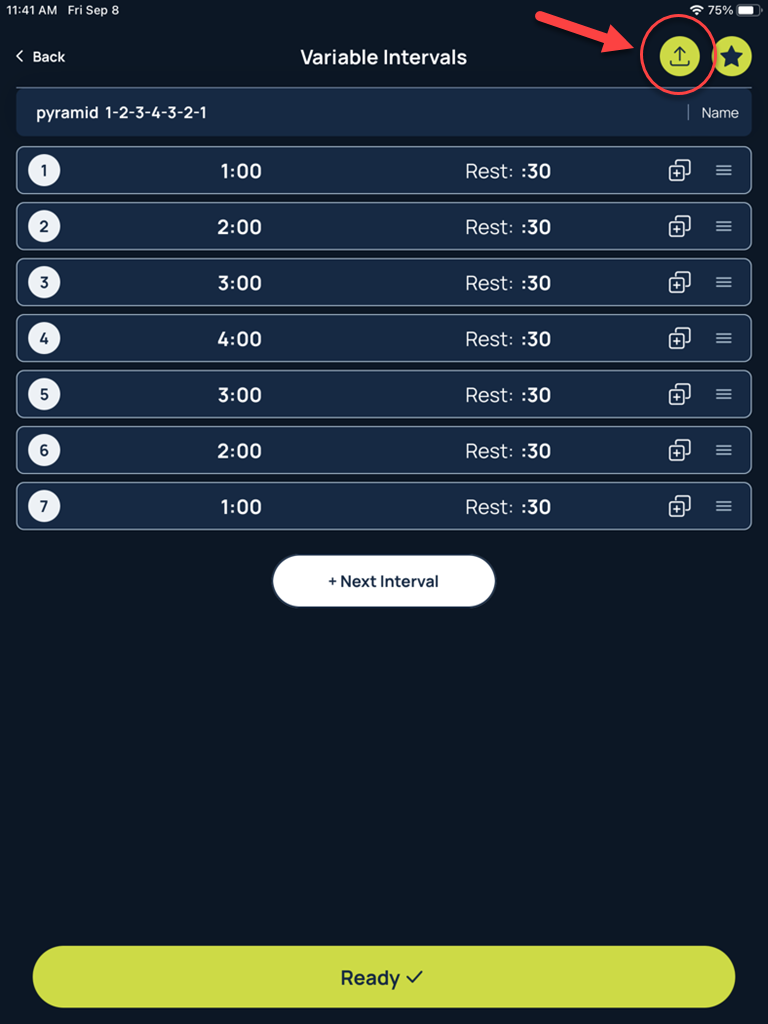 Opprett eller åpne treningsøkten i ErgData. (Treningsøkten kan være i ErgData-loggboken din, i Favoritter eller Nylige, eller en treningsøkt du nettopp har opprettet.) Når du har treningsøkten på skjermen, klikker du på del/eksport-ikonet øverst til høyre. Se bildet:
